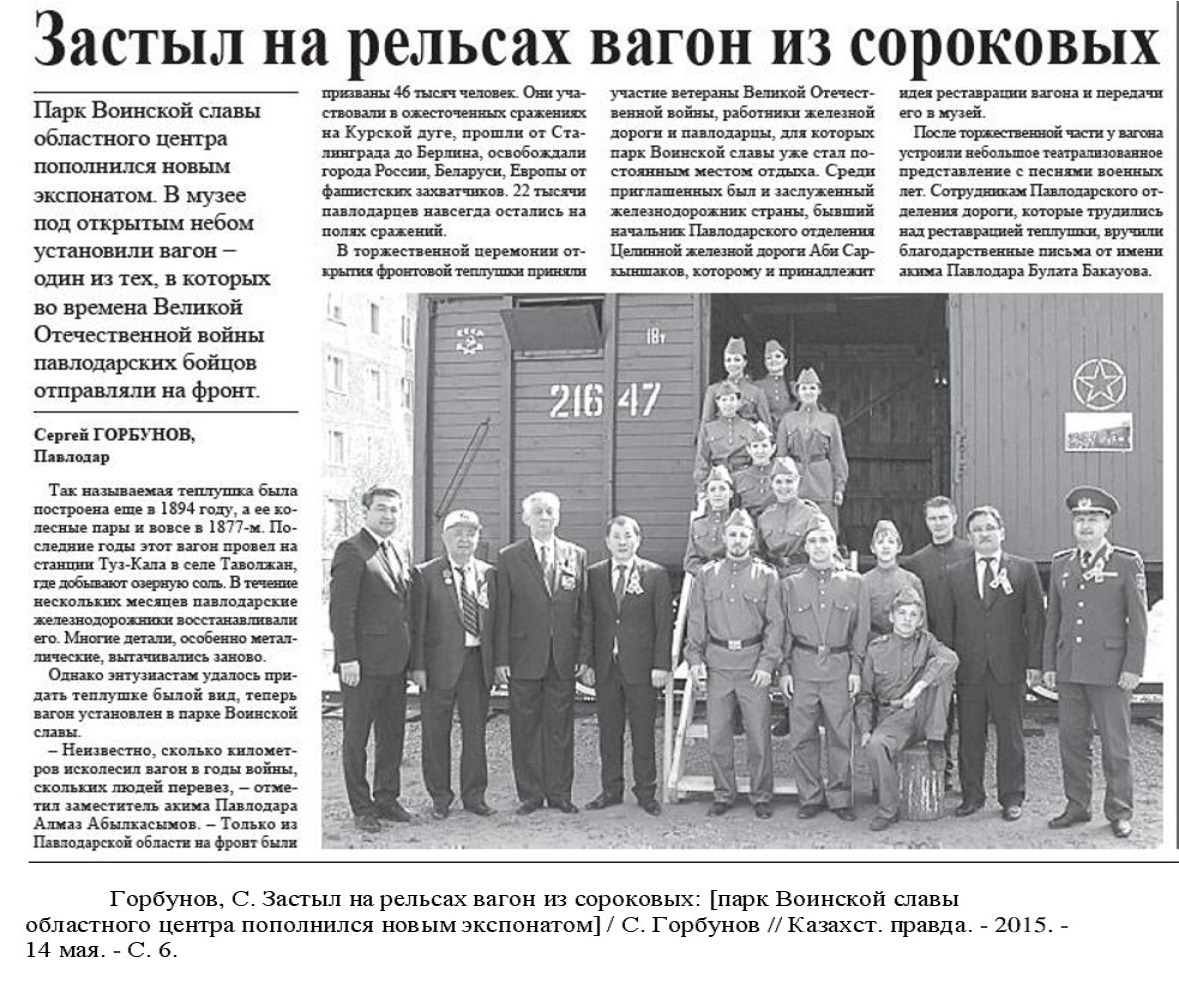 Горбунов, С. Застыл на рельсах вагон из сороковых: [парк Воинской славы областного центра пополнился новым экспонатом] / С. Горбунов // Казахст. правда. - 2015. 14 мая. - С.6.